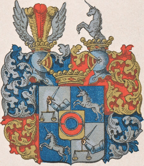 … en Fyradubbel fördelt sköldh, där mitt uthi deras förra gambla Adelige wapen som ähr en …….., ett mitt uthi och fyra … uthi ett guult feldt; Vthi den öfwerste skölden på högre och nederste på wenstre sijdan een bewäpnadt Arm hållande uthi handen ett bart swärdh… wicht skååler …vnder uthi hwitt feldt; Vthi den öfwersta på wenstre och underste skölden på högre sijdan en hwijt Enhörning uthi blått feldt; Åfwan oppå skölden en FrijherreChrono emillan twenne öppne tornerhiälmar, Täcken och Crantzarna medh rödt, guult, blått och hwijtt fördeelte, och hwarvthi en hiälmen medh en frijherreChrono oppå; Vthur den högre hiälmChronan oppstå trenne Strutzfiedrar, den mellersta röd och dee andre … guule emillan twenne röda wingar och vthur den wänstra hiälmChronan en half hwijt Enhörning…….sine egentlige och naturlige fergor här hooβ ähe repræsenterat och afmålat finnes….