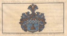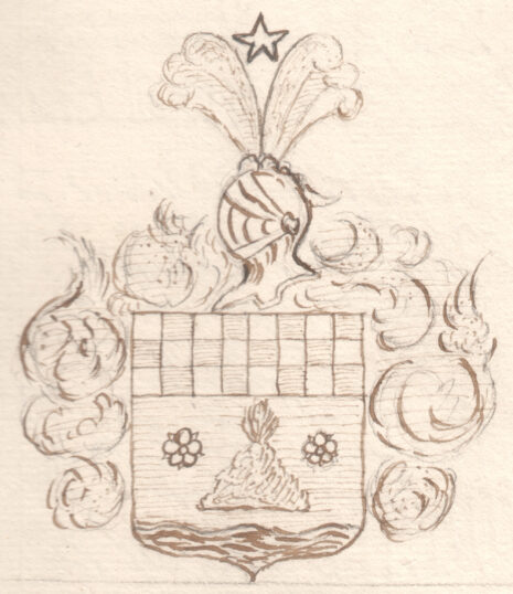”… En Blå Skiöld, hwaruti ett brinnande Berg af Guld står, sidosatt med 2ne Fembladige Silfwer Rosor. Ofwanföre är en Chef af Silfwer och Blå rutor, uti 3ne rader delt, Åtta på hwarthera: Och nedanföre uti stammen flyter Wågwis en Ström af Silfwer. Ofwan uppå Skiölden står en Öpen Torner Hielm med Sex Struts-Fiedrar Zirad, the innersta af Guld emellan hwilka en FemUddig Gyllende Stierna glindrar; the medlersta Blå; the yttersta af Silfwer. Hielm-Crantzen och LöfWärket ar af Guld Silfwer och Blått; aldeles som thetta Wapn med sine egntelige färgor härhos afmålat finnes.”