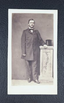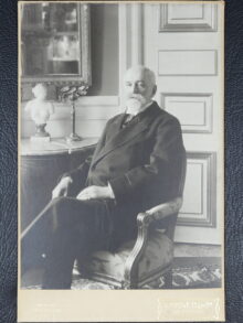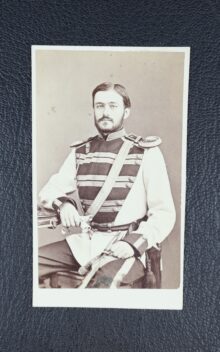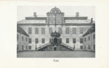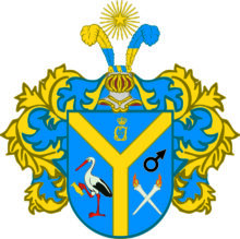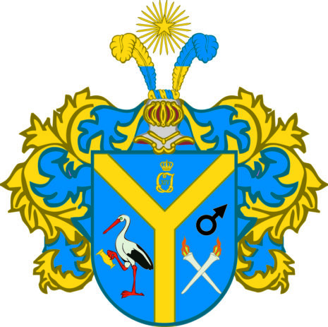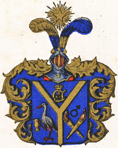 ”… En blå sköld, medelst ett gyllene pythagoriskt kors delad i tre delar. I den öfversta lyser Hans Maj:t konung Carl XIV Johans höga namnchiffer af guld, betäckt med kunglig krona. I högra fältet står en till höger vänd hvit stork, hållande i högra upplyftade foten en offerkanna af guld. I venstra fältet åter äro två i kors lagda facklor af silfver, öfver hvilka står jernets tecken af stål. På skölden hvilar en öppen tornerhjelm, prydd med en af guld och blått sammanvriden hjelmkrans, öfver hvilken sväfvar en med strålande gyllene gloria omgifven femuddig nordstjerna af guld emellan tvänne ät hvar sida utåt viftande strutsfjedrar, sins emellan så växlande färger, att den högra är till öfre hälften af guld och till den nedra blå men den venstra tvertom eller uppåt blå och nertill af guld. Skölden omgifves öfverst af löfvärk, som utvändigt är af guld men innantill blått, alldeles såsom vapnet här ofvan med sina rätta och egentliga färger afmåladt finnes. . . .”