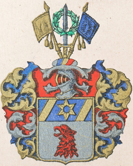 ..En Skiöld af Silfwer hwaruti står ett rödt Örnehufwud öfwerst i Skiölden är en blå Chef zijrad med en gyllende Molett emillan twenne Barrez af gull ofwan på Skiölden står en oppen Tornerhielm hwaruppå Synes en bar Wärja med spetzen up åth genom en grön lagerbär Crantz emillan twenne Estandarer hwaraf det högre är af gull och det wänstre blått, Crantzen och löfwärcket är af gull Silfwer blått och röd som detta Wapen med sina rätta färgor här hoos af målet finnes…