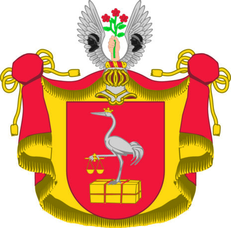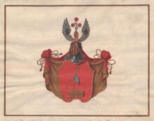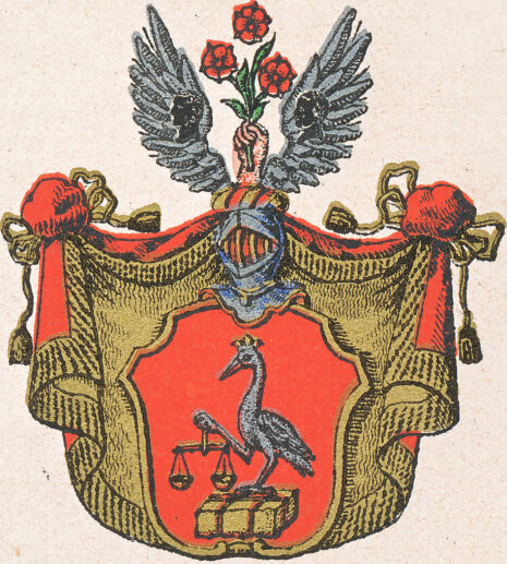 ”… En Röd Skjöld, hwaruti förekommer en waksam till Höger wänd Trana af Silfwer, med en Crona på Hufwudet af Guld, hållande i stället för en Sten, en wigtskål af Guld i högra Foten, och stående uppå en Ballot af Guld, med Röda Snören Omslagen. Ofwan utur den Öpna Tornere Hjelmen, emellan Twenne Utslagne Wingar af Silfwer, upräckes en Hand af Naturlig Färg som Håller Trenne om hwarannan wefwade Rosenstjelckar, med Tre Röde Fem bladige Roser: och hwardera Wingen är belagd med ett till Höger wändt Morians Hufwud. Hjelm Krantsen är af Guld och Rödt, och Wapentäcket är till Yttra sidan Rödt, men till den Inra af Guld. Aldeles som samma Wapen med sina rätta och egenteliga Färgor hår åfwan före afmålat finnes.”