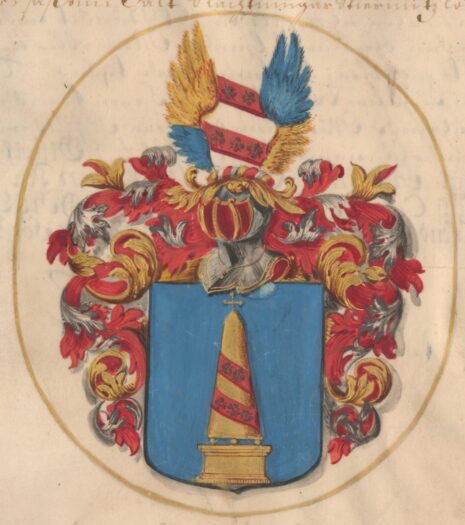 ”… utj ett blått Fält ett förgylt Torn medh Korβ oppa Spetzen, och Tree Knappar eller Kuhlor inunder, så och twenne sluut öfwer Tornet liggiande röda band, utj den öfre Twå, och i den nedre Tree hwijta Roosor, ofwan på Skiölden een öppen Torrner Hielm, och dheröfwer Twå emoth hwar annan uthslagne Wingar, hwilka medh Gull och blått mitt i tu så äre fördelte, att den Högre Wingans öfredeehl är förgyld, och den nedra blå, twert om åter den wänstras Öfredeel blå, och den andra förgyld, och emillan Wingarne sådanne twenne band medh Roosor besatte, som öfwer Tornet liggia, Löfwärket är medh Gull, hwitt och rödt bemängt, aldeles som sielfwa Wapnet medh des egentelige Färgor här hoos står afmåhlat och repræsenterat.”
