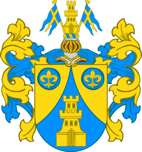 ”… Skiölden fördeeld igenom twänne spitzigt upgående streek i trenne delar, de begge öfre Fälten äro af Guld, hwaruti ligger en blå Kuhla, Zijrad med en gyldene Lillia i hwardera Fältet; det nedre Fältet är blott, hwar i wijsar sig ett dubbelt Torn af Guld; ofwan på Skiölden står en öpen Torneerhielm, hwaröfwer står ett äfwen slijkt Torn, som i det nedre Fältet, emellan twänne Swenska Cron-flaggor. Krantzen och Lööfwärcket är af Guld och blott, aldeles som detta wapnet med deβ egentelige färgor här hos afmålat utwijsar.”