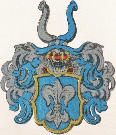 …Skölden blå där Vthj en hwitt dubbell Lillia, åfwan oppå Skölden en öpen Tornerehielm, Täckedh och Crantzen medh blått och hwitt fördelte, Åfwan opå Hielmen twenne boffelhorn, den högre hwitt och den Wänstre blå, alldeles som dedh medh sine egentlige färgar här repræsenterat och afmålat står…..