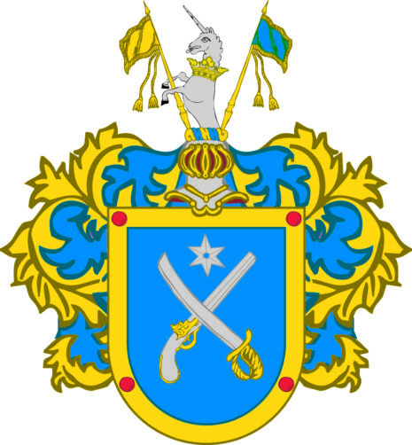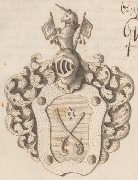 ”… En Blå Swensk Sköld hwarutinnan ses en Palatsch och en Pistol i kors lagde, Palatschen af Silfwer med Gyllende Fäste wänd till Höger, och Pistolen äfwen af Silfwer med Gyllende lås wänd till Wänster, åtföljde ofwantill af en Sexuddig Silfwer Molet, warande Skölden infattad i en Ram eller Bordure af Guld, prydd med Fyra Röda Kulor, en uti hwarthera hörnet. Uppå Skölden är en Öppen Tornerhielm, och däruppå stå uppreste Twenne Estandarer, det högra af Guld och det wänstra Blått, bägge med Gyllende Frantsar och Tofsar, och emellan dem upstiger till hälften en mot Höger wänd Enhörning af Silfwer med en Gyllende Krona om halsen. Hielmkrantsen är wriden af Guld och Blått, och Skölden är omgifwen af Löfwärk, som i Dagen är af Guld och i grunden Blått, Alldeles som detta Wapen med sina rätta färgor här afmåladt finnes.”