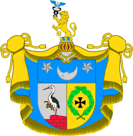 ”… En Skiöld mitt i tu klufwen, uti hwars Högra Fält, som är af Silfwer, wisar sig en gammal Rödachtig Muur, hwaruppå en rättwänd Stork af naturlig Färg hwilar: hållandes emellan Kloon, uti des uplyffte högra Foth, en Orm, som sig omkring Benet slingrar: Det Wenstra Fäldtet är af Guld, zijrat mittuppå med ett litet Swart Runne Korsz emellan twenne gröna Lager-qwistar, hwilka så ofwan- som nedantill kors-wijs öfwer hwarandra ligga. Ofwanför är en Blå Chef, hwarutinnan et Silfwer Tungel nederst lyser, och öfwerst glindra twenne i Triangel satte Stiernor af samma Metall. Ofwan uppå Skiölden står en Öpen Tornerhielm, hwarutur upstiger Öfre dehlen af ett Gyllene Leijon, hwilket uti Högra Rahmen håller Mercurii Staf af Silfwer med Blå wingar beprydd och swarta Ormar omslingrad; Men uti den Wenstra en med Axet upåtwänd Guld-Nyckel. Hielm-Crantzen och Täcket är hälften af Guld och Blått emot hwarandra fördehlte, aldeles som detta wapen med des egentelige färgor härhos afmålat finnes.”