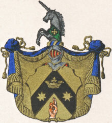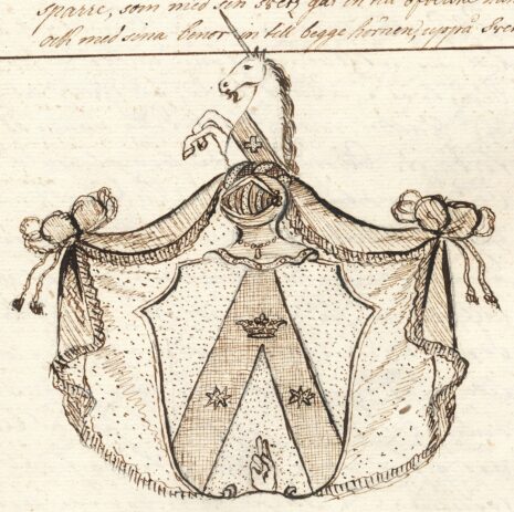 ”… En Gyllende Skiöld, hwaruti sees en Swart Sparre, som med sin Spetz går in till Öfwersta Kanten af Skiölden, och med sina benor in till begge nedra Hörnen. Uppå Spetsen af Sparren är lagd en Crona af Guld, och mitt på hwardera benan en Stella Chymica eller Siu Uddad Stierna. Wid foten af Skiölden eller emellan benorne af Sparren sees en upräckt hyllande Hand, med Twå utsträckte Fingrar af Nalurlig Färga. Ofwan uppå den Öpne Tornere Hielmen sees en halft upstigande och mot Höger sig wändande Enhörning af Silfwer öfwer hwars bröst och hals hänger en grön Bande, som med ett Kors af Guld är belagdt. Krantsen är af Guld och swart, men Wapentäcket är utan på grönt och innan till af Guld. Aldeles som detta Wapen med sina rätta och egenteliga Färgor här bredewid afmålat finnes.”