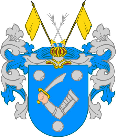 ”… Een blå Skiöld hwaruthj är een bewäpnad Arm, hållandes een Sabel af Sölfwer emellan Trenne Kuhlor af samma Metall åfwan på Skiölden är een öpen Torrnerehielm hwaröfwer ståå ett pahr Korßwijs stälte Sölfwerfärgade pijhlar, hwilkas Spitzar wetta uthföre emellan Twenne Fahnor af Gull, Krantzen och Löfwärket af Sölfwer och blått mängt och fördeelt, aldeles som sielfwa Wapnet medh sina egentelige färgor här hoos står afmåhlat.”