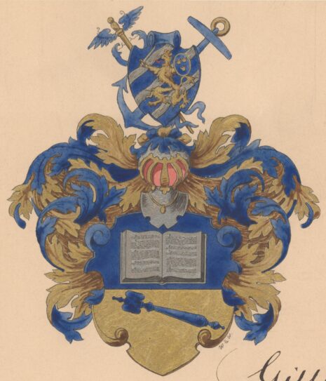 ”. . . En delad sköld, i hvars öfre blå fält ligger en uppslagen bok af silfver, innehållande Sveriges grundlagar, och i det nedre af guld en balkvis liggande blå talmansklubba med skaftet nedåt. På skölden hvilar en öppen tornerhjelm, prydd med en af guld och blått sammanvriden hjelmkrans, på hvilken hvilar en upprättstående sköld med Göteborgs vapen. Bakom denna sköld stå korsande hvarandra, till höger en gyllene merkuriestaf med blå ormar och vingar samt till venster ett likaledes blått ankare med gyllene ring. Skölden omgifves af löfverk, vexelvis af guld och blå färg. . . .”