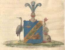 ”… En blå Skjöld, ginstyckad af en gyllende Ginbalk, uti hwilken ligger en Ekelöfs qwist med gröna blad och frukter eller ållon. I Skjöldens öfra del ses en antik Lampa af guld med trenne gyllende lågor, och hängande med ring och kedja af guld. I den nedra åter framsticker från Ginbalken en ornerad gyllende Framstäf af ett antikt Krigs-Skepp. På Skjölden står en öppen Tornerhjelm, belagd med en af guld och blått sammanwriden Hjelmkrants, hwarutur uppstiga trenne blå Srussfjädrar, af hwilka den medlersta är midtpå prydd med en femuddig, med ena spitsen uppåt wettande Stjerna af Silfwer, under hwilken står upprest en gyllende Nyckel med axet till höger wändt. Skjölden hålles å högra sidan af en Trana och wid den wänstra ligger en Delfin, med uppåt slagen stjert, bägge på en grönskande Strand och med utåt wände hufwuden. Aldeles som det med sina rätta och egenteliga färgor här afmåladt finnes.”