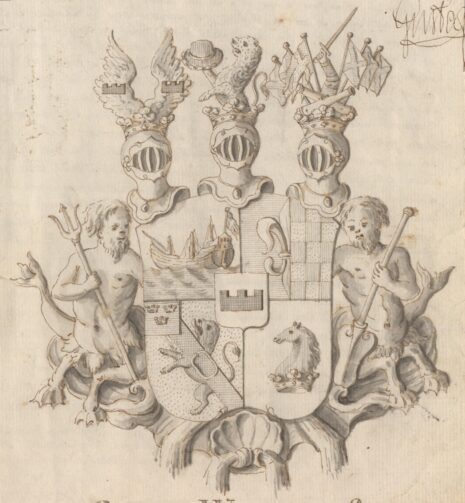”… En uti Fyra Fält delad Skjöld, belagd mitt uppå Fördelningen med en Hjertskjöld, i hwilcken Stamwapnet, som är en swart fritt stäld Mur med Trenne Tinnar uppå i Silfwerfält sig wisar. Uti Högra öfra Fältet af det Grefliga Wapnet, som är af Silfwer, synes ett i blått wattn flytande redlöst Skepp, wändt till Höger. I det öfra Högra Fältet till Wänster, ses det Kruseska Stamwapnet, som är Klufwit. I den Högra Blå delen synes en Half Fransk Lillja af Silfwer, och i den Wänstra Femton Schack Rutor, af Guld och Rödt till skiftes, Fem i Högden och Trenne i bredden. Det Nedra Fältet till Höger, som är af Guld, utwisar det Spensiska Skjöldemärcket, ett mot Höger uprest Rödt Leijon, Bandewis öfwerlagt med en Swart Rem, som mitt uppå är hopfogad med ett gyllende Spänne, warandes i Öfra Högra Hörnet af detta Fält en Fyrkant eller så kallad Francquartier af blå Färg, hwaruti sig wisa Tre gyllende Cronor, Twå ofwan och en under. Det nedra Fältet till Wänster är af Silfwer och deruti är en Gyllende Crona, utur Hwilcken upstiger ett till Höger wändt rödt Häst-Hufwud som är desz Mödernes det Ram-ska Wapnet. Ofwan på Skjölden äro Trenne med Greflige Cronor betäckte Öpne Tornere Hjelmar; På den Högra stå Twenne Wingar af Silfwer, begge belagde med en sådan Mur, som i Hjertskjölden. Utur den medlersta upstiger till Hälften ett Gyllende Leijon, Hållande uti Högra Ramen en Röd Hermelins-brämad RådsHatt. Och på den wänstra ses en Stålklädd Höger Arm, som Håller ett bart Swärd, nederst belagd med Twenne i Snedkors liggande Canoner och fölgd af Sex Flaggor, Tre på Hwardera sidan stäldte, af Hwilcka den Öfra Högra är Swensk med de öfrige Fem Ryske. Skjöldhållare äro till Höger en Wattuman, med sin Treuddiga och upåt wände Gaffel i handen, och till Wänster en dylik Wattuman wändande sitt Roder nederåt: Hwilande lika som Skjölden på en med Snäckor och rinnande wattn decorerad Pied d’Estal, uppå hwilcken ett Hwitt Fladdrande Band synes, hwarå Walspråket Ne Cede Malis, med swarta Bokstäfwer finnes. Aldeles, som det samma Här framföre med sina rätta och egenteliga Färgor afmålat finnes.”
