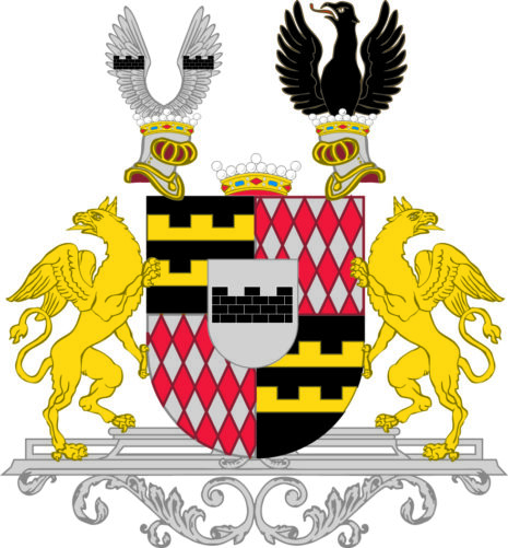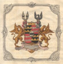 ”… En i Fyra delar tecknad Skjöld, belagd i hjertat med Wrangelska Adeliga Wapnet af Sag och Waschel, bestående af en Silfwer Skjöld, hwaruti en Swart Tinskuren Mur är bjelkewis stäld. Thet första och fjerde Fältet af Friherre Wapnet är swart, hwatthera belagde med Twänne öfwer hwarandra gående och ofwantil Tinskurne Gyllende Bjelkar. Thet andra och tredje Fältet är ock lika, bestående af rätt upstående Silfwer rut-wärk i rödt Fält. Skölden är betäckt med en Friherrlig krona imellan twänne med thylika kronor beprydde öpne Torner-Hjelmar, hwaraf then til höger äger twänne utslagne Wingar af silfwer uppå sig ställde, hwarthera belagde med en sådan mur, som Hjert-Wapnet innehåller: utur then wänstra upstiger til hälften en med utslagna wingar, och til höger seende Swart Örn. Skjölden hålles af twänne med hufwunen ifrån Skjölden utwände, samt med wingarne utslagne Gyllende Gripar; Alldeles som thetta Wapn med sine rätta färgor här hos afmåladt finnes.”