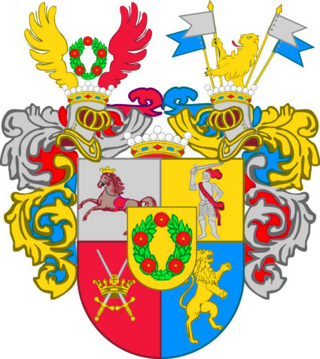 ”… Een fyradubbel fördeelt Sköldh, der midt vthi som förra Wredernes Stamwapn warit hafwer, een grön Lorbehr Crantz medh fem röda Roser Vthj ett guhlt Fiäll. Vthi den öfwerste Skölden på högre sijdan een brunachtigh springande häst, Sahlat och oppbetzlat, hafwandes på hufwudet een Gyllende Chrona vthi ett hwijt Fiäll: Vthi den öfwerste Skölden på wänstre sijdan een Mann i fult Couretz med ett bart Swärd i handen, hafwandes ett rödt Fäldtekn kring om sigh och een rödh Plumatie j Caschetten vthi ett guhlt Fiäll: Vthi den högre nederste Skölden een Gyllende Chrona medh twenne i Korβ stående blancke Swärdh vthi ett rödt Fiell: Vthi den wänstre nederste Skölden ett guhlt Leijon vthi ett blått Fiäll: Åfwan på Skölden twå opne Tornerehielmar. Hielmteket och Crantzerne med guult, blott, rödt och hwijt fördelte; Hwarthera Hielmen med een Frijherre Chrona på: På den högre Hielm Chronan står een Lorbär Crantz med fem röda Roser emellan twenne wingar, den högre guul och den wänstre rödh. Vthur den wänstre Hielm Chronan opstår ett guhlt Leijon, hafwandes i den högre footen een blå Flagga och i den wänstre een hwijt Flagga. Bakom Leijonet står i lijka motto een blåå och een hwijt Flagga, aldeles som heela detta wapnet med sine egentelige färgor här hoos repræsenterat och affmåhlat står, …”