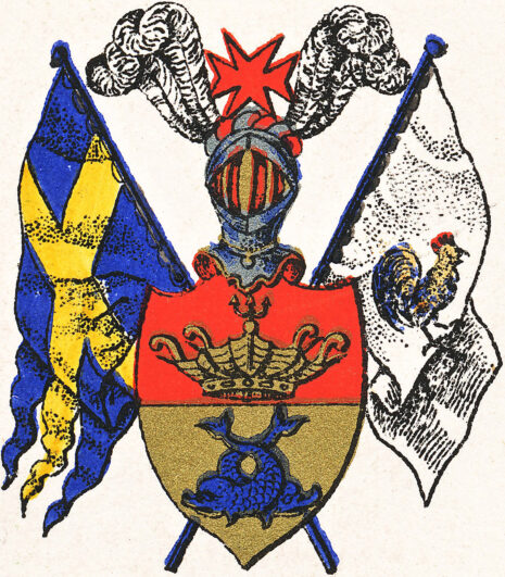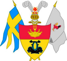 ”… En så kallad Engelsk Sköld, tverdelad till tvenne fält. I det öfra, som är rödt, ses en antik Corona Navalis af guld, genom hvilken är stungen Neptuni gyllene Treudd. I det nedra, som är af guld, stå tvenne korsvis ställde Delfiner af naturlig svartblå färg, med utåt vända hufvuden och korsvis öfver hvarandra uppsträckta Stjertar. På Skölden är en öppen Tornerhjelm, uppå hvars valk eller krans af guld och rödt står ett rödt åttauddigt Ordenskors, emellan tvenne Strussfjädrar åt hvar sida. Bakom Skölden ligga korsvis, till höger Svenska, till venster Franska Örlogsflottans Flagg, åt hvar sitt håll utåt fläktande; Alldeles såsom detta Vapen här med sina rätta och egentliga färger afmåladt finnes.”