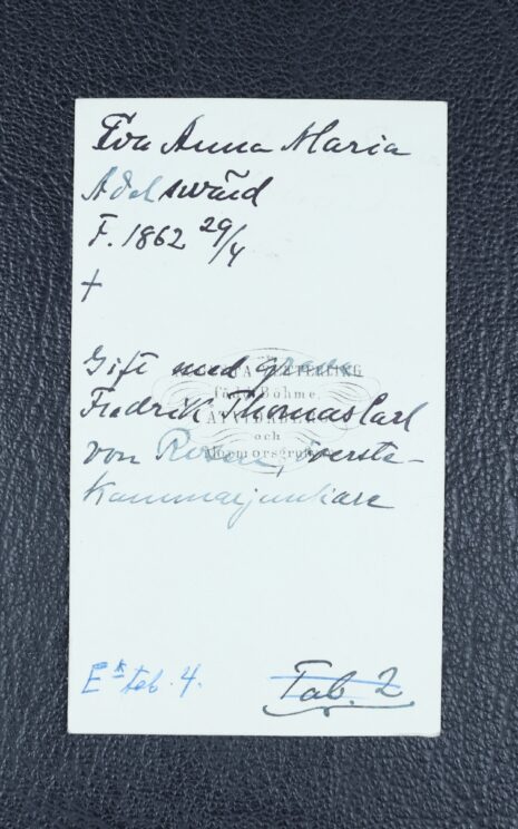Adelswärd, Eva Anna MARIA, gift grevinna von Rosen, nr 85. Född 1862-04-29. Död 1944-04-04.