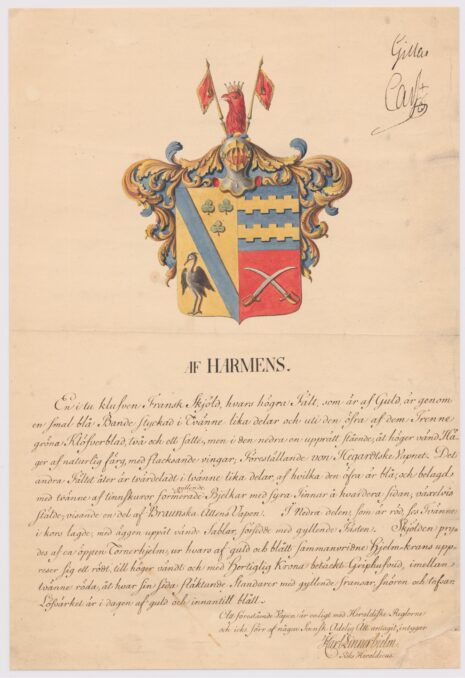Approberad vapenritning för utdöda adliga ätten af Harmens, nr 2209.