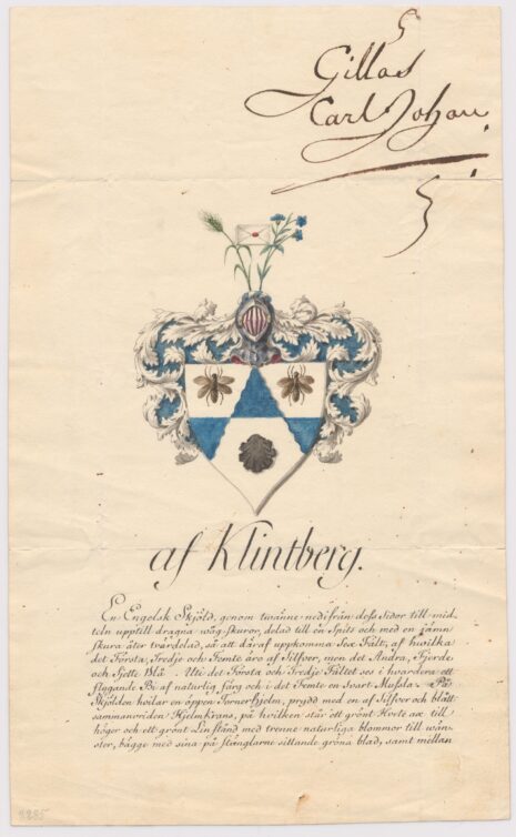 Approberad vapenritning för adliga ätten af Klintberg, nr 2285.