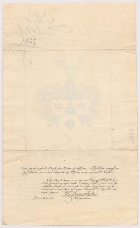 Utförd: Riksheraldiker Jonas Carl Linnerhielm, Ebbetorp, 1821-04-21.