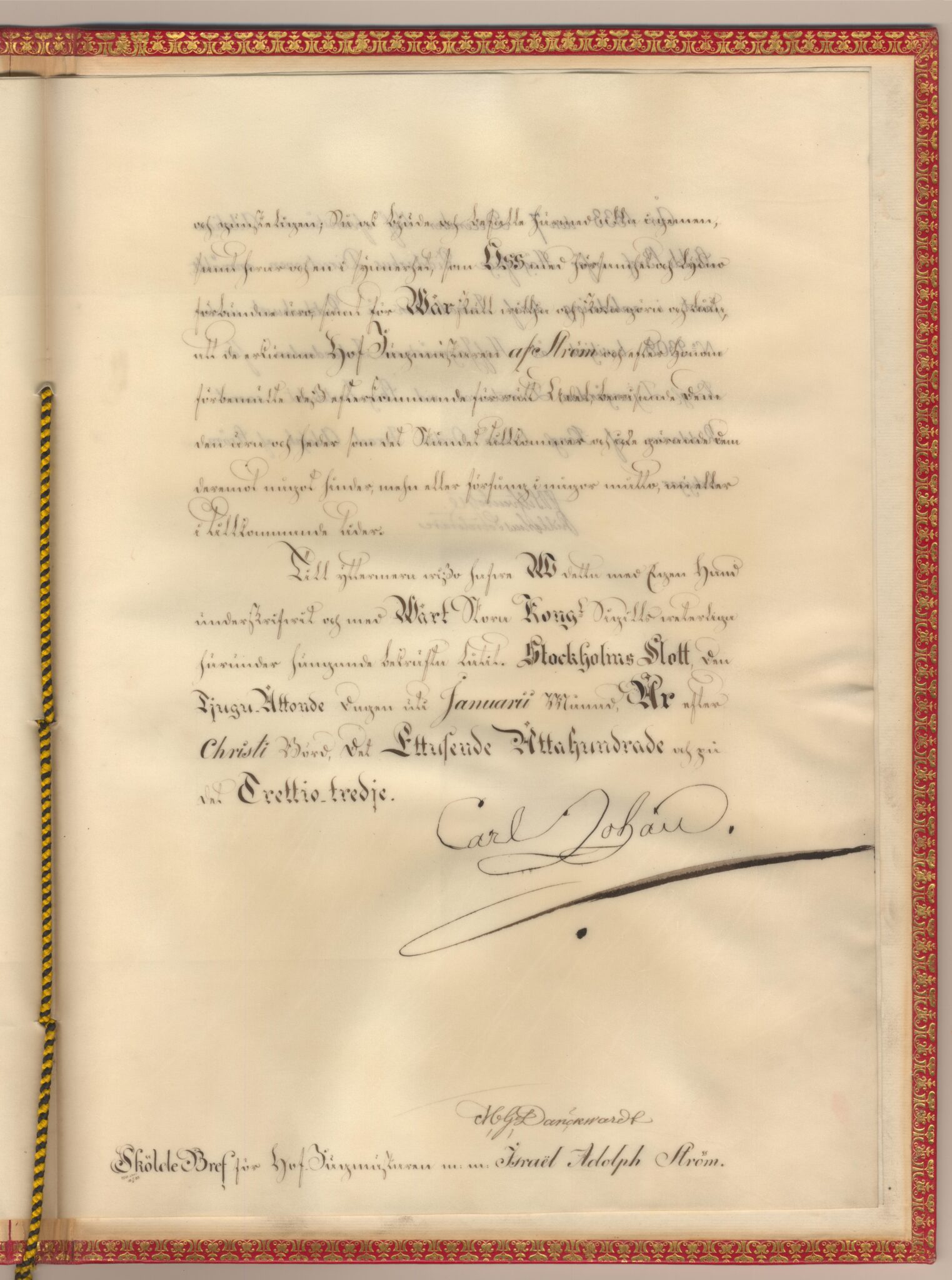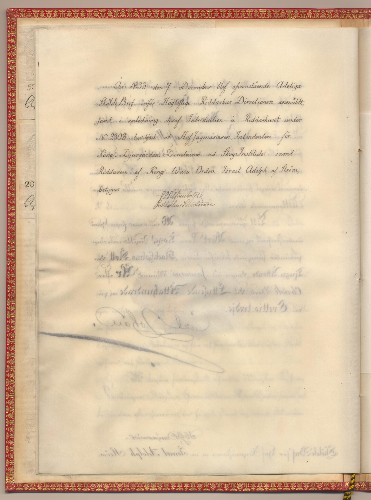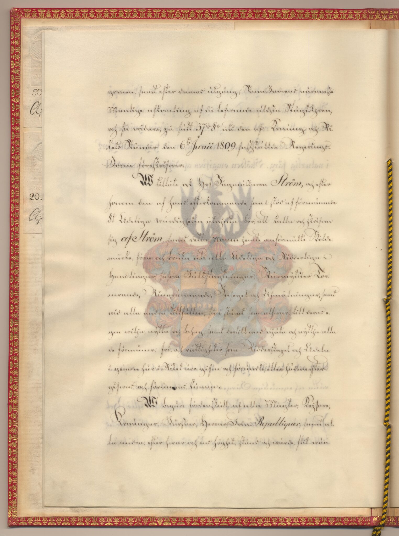 Sköldebrevet i original för adliga ätten af Ström, nr 2308.