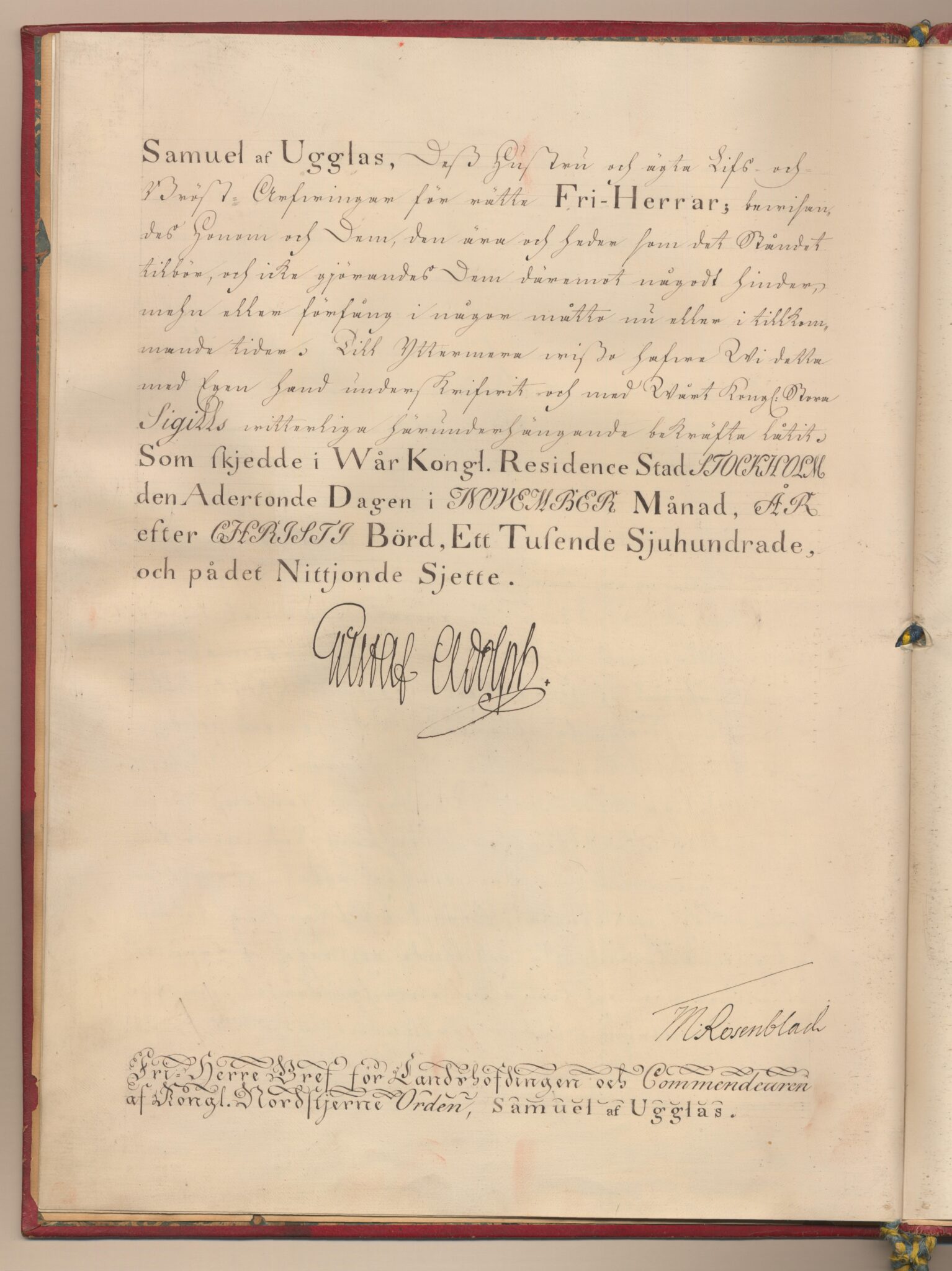 Friherrebrevet i original för friherrliga ätten af Ugglas, nr 311.