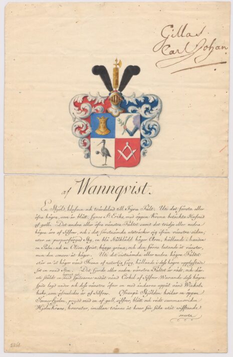 Approberad vapenritning för utdöda adliga ätten af Wannquist, nr 2268.