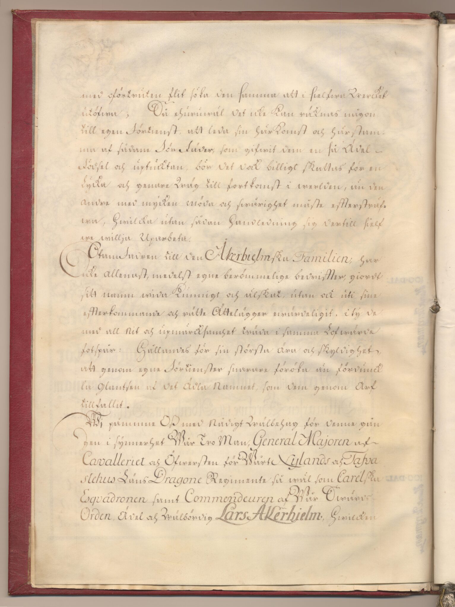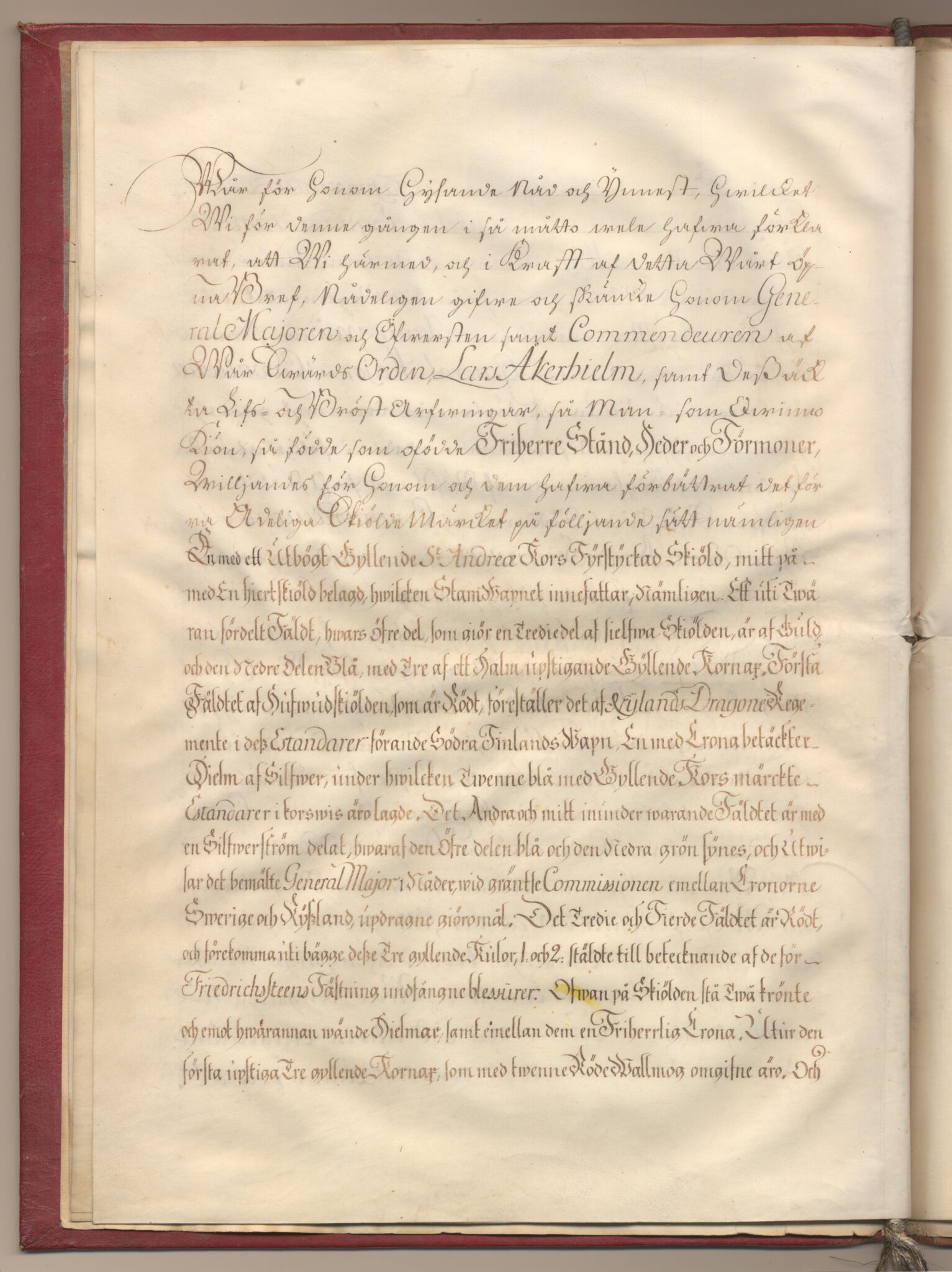 Friherrebrevet i original för friherrliga ätten Åkerhielm af Blombacka, nr 232.