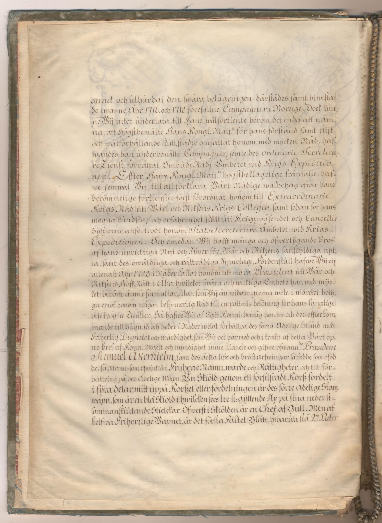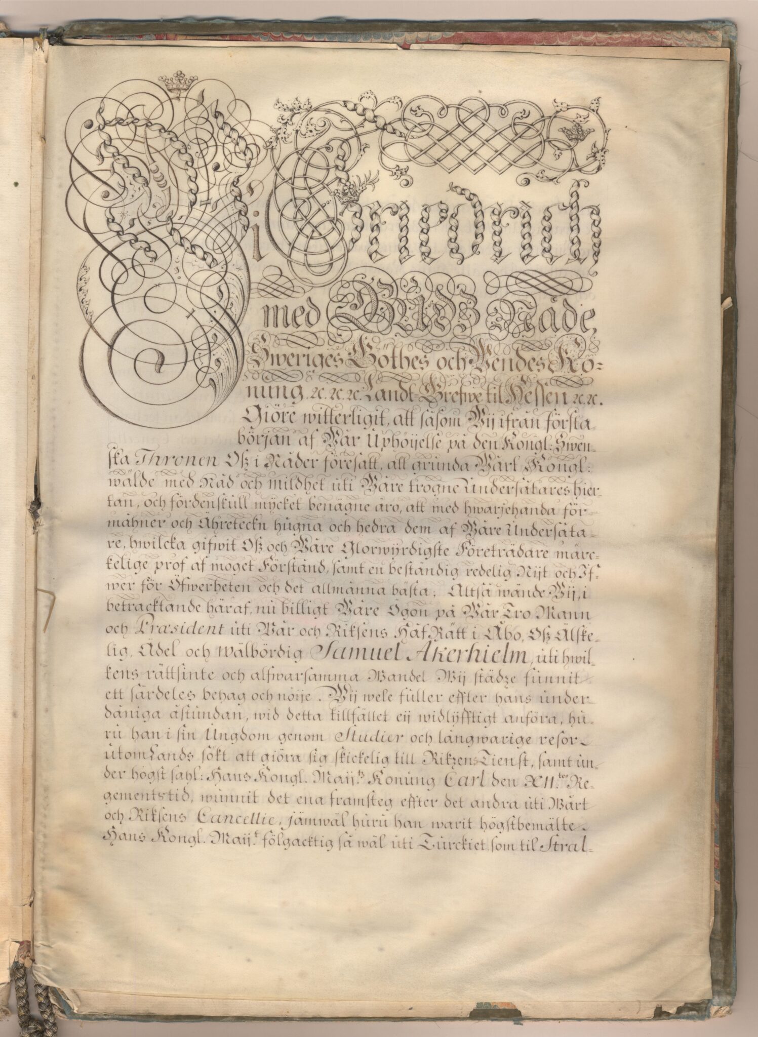 Friherrebrevet i original för friherrliga ätten Åkerhielm af Margrethelund, nr 205.