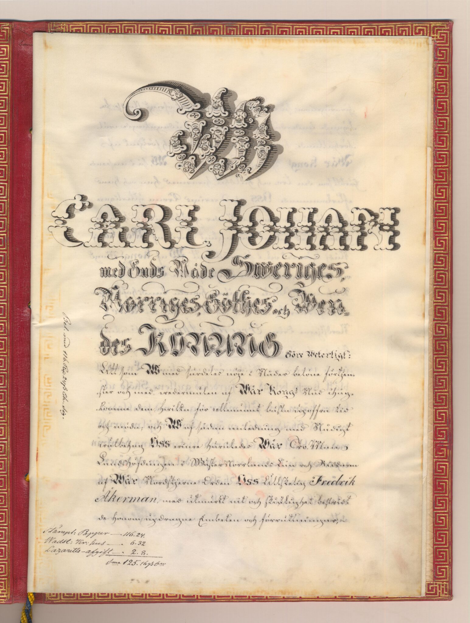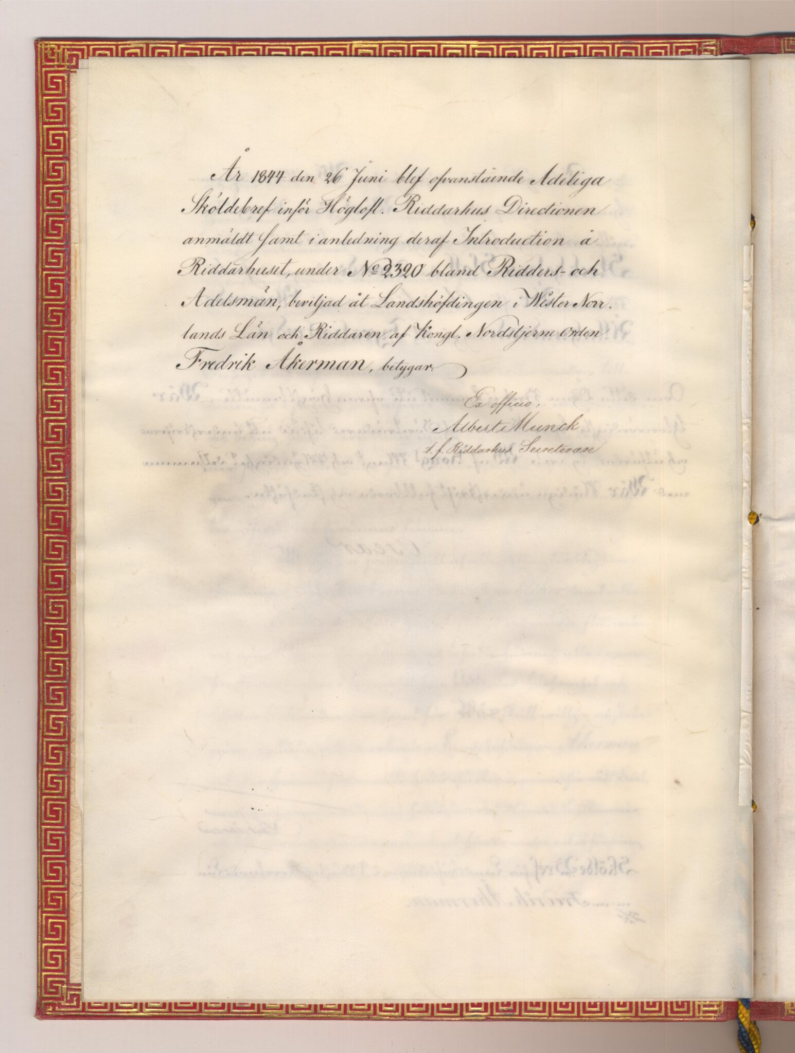 Sköldebrevet i original för utdöda adliga ätten Åkerman, nr 2320.