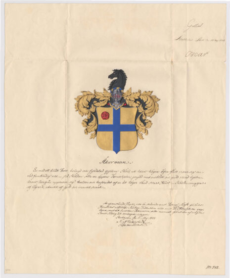 Approberad vapenritning för utdöda adliga ätten Åkerman, nr 2320.