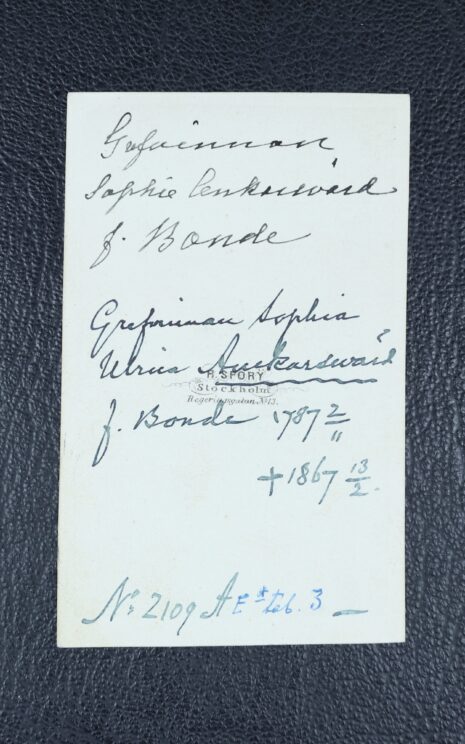 Anckarsvärd, Sofia (SOPHIE) Ulrika, född friherrinna Bonde, nr 20. Född 1787-11-02. Död 1867-02-13.