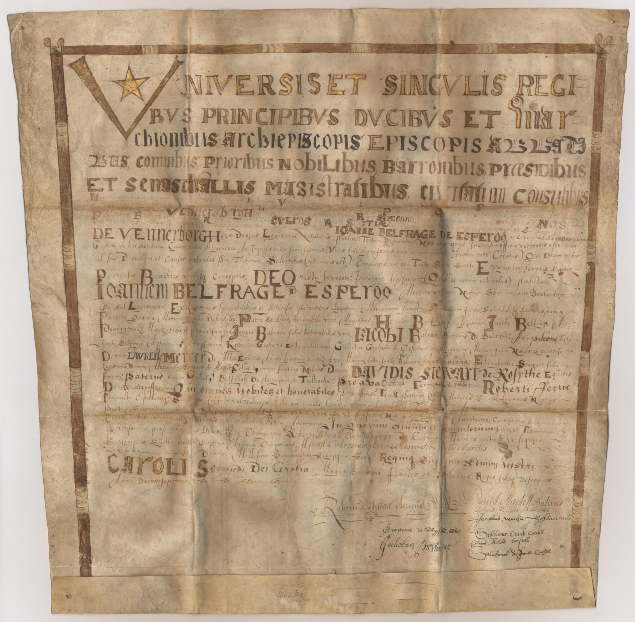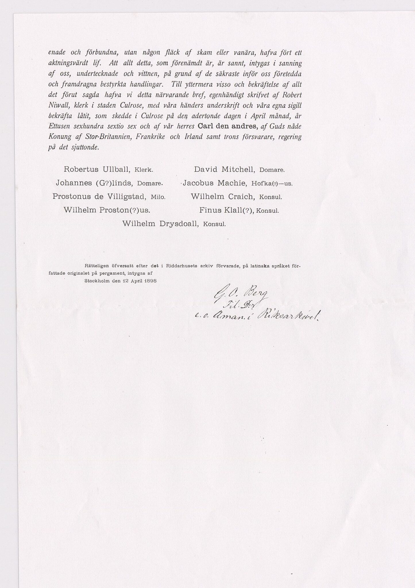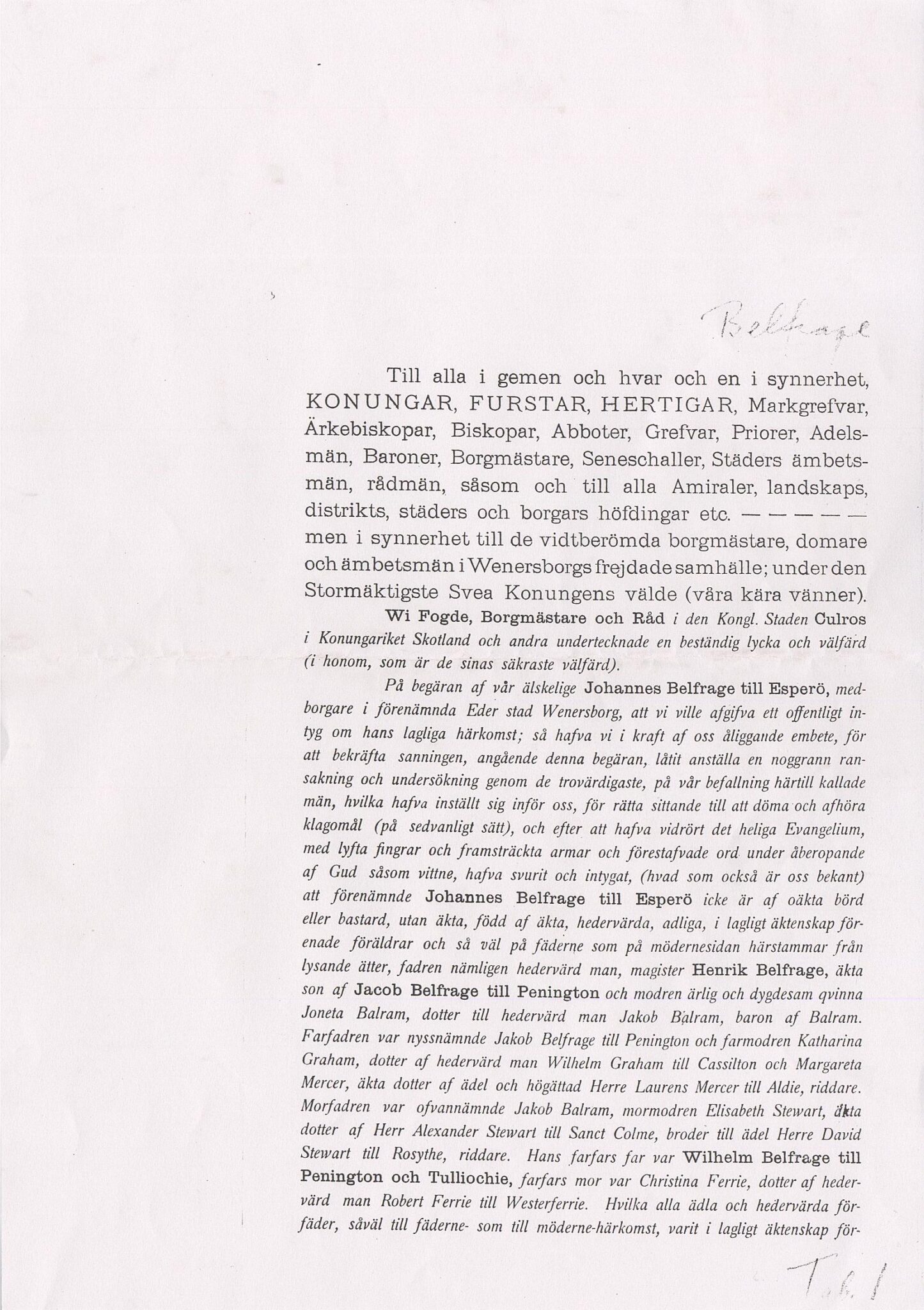 Detta certifikat är skrivet av fogde, borgmästare, och Råd i kungl. staden Culros, i kungariket Skottland gives offentligt intyg på Johannes Belfrage till Esperö lagliga härkomst.