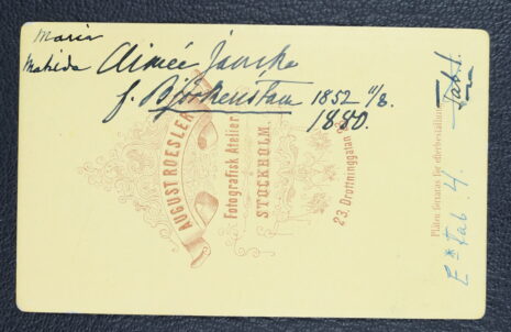 Björkenstam, Maria Matilda AIMÉE, gift Jancke. Född 1852-11-08. Död 1945-10-26.