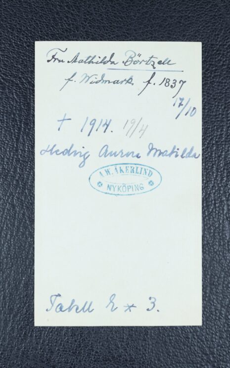 Börtzell, Hedvig Aurora Mathilda (THILDA), född Widmark. Född 1837-10-17. Död 1914-04-19.