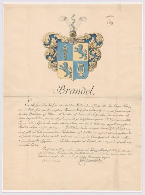 Approberad vapenritning för utdöda adliga ätten Brandel, nr 2250.
