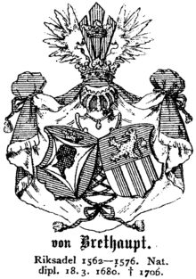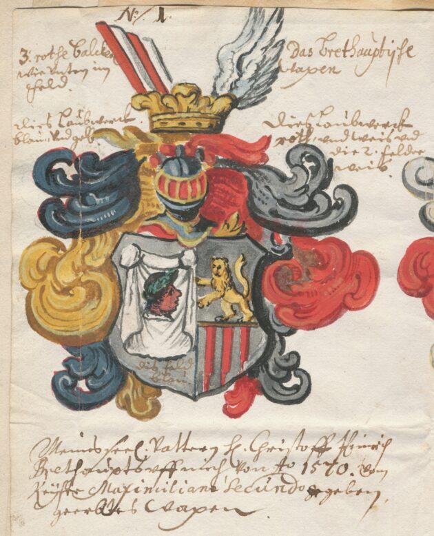 Sköldebrevet i avskrift för utdöda adliga ätten Brethaupt, ointroducerad.