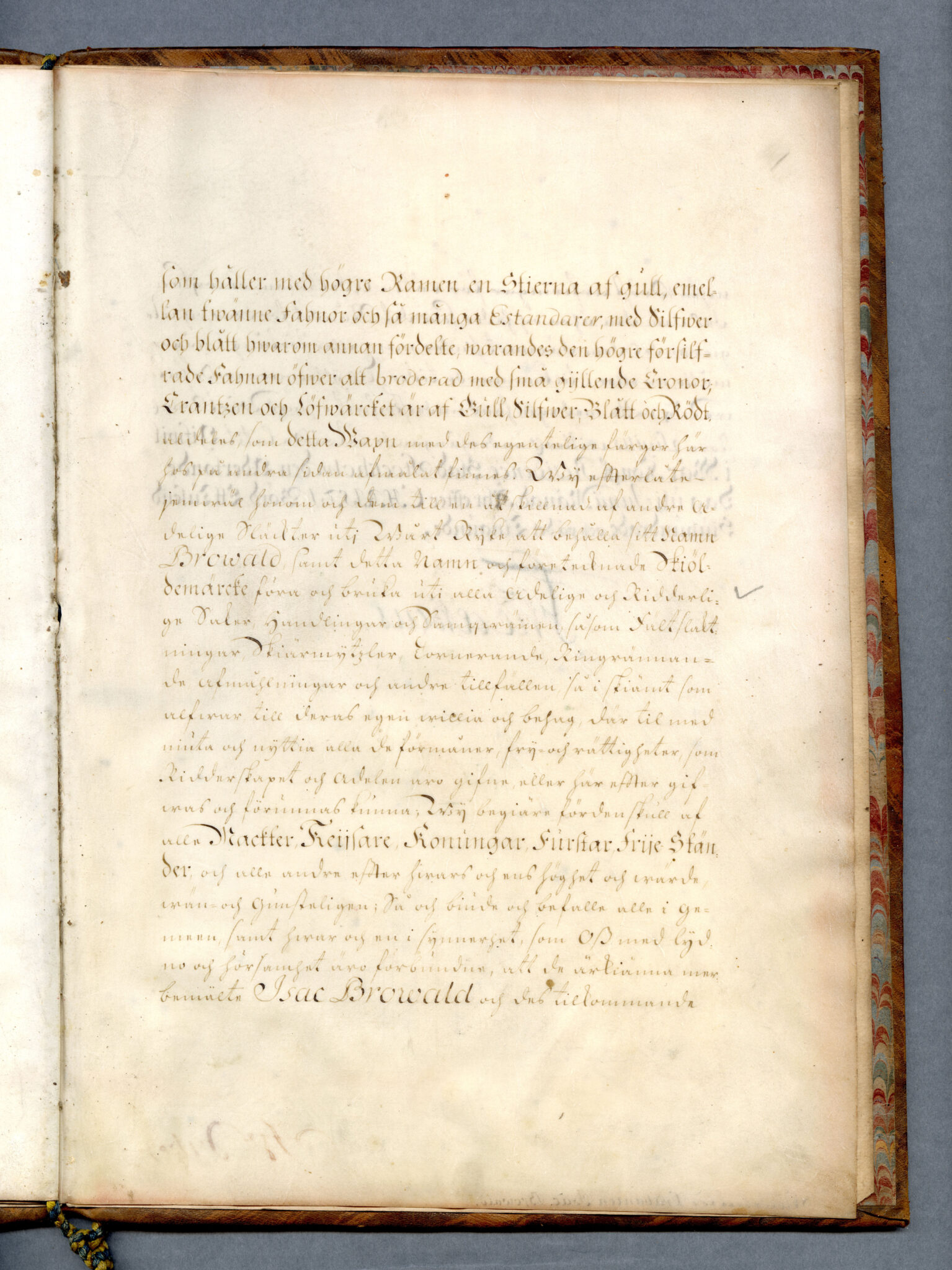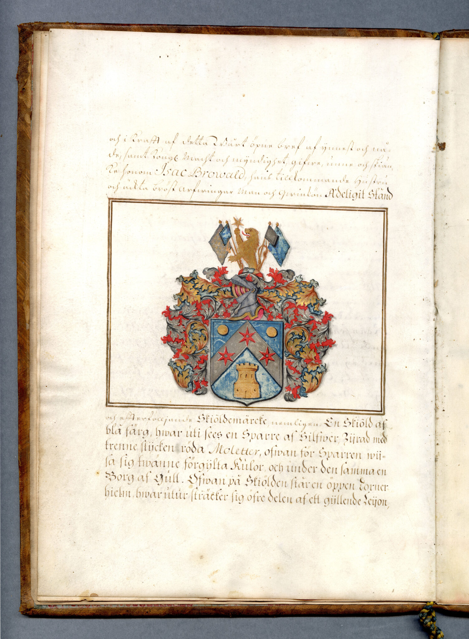 Sköldebrevet i original för utdöda adliga ätten Browald, nr 1764.
