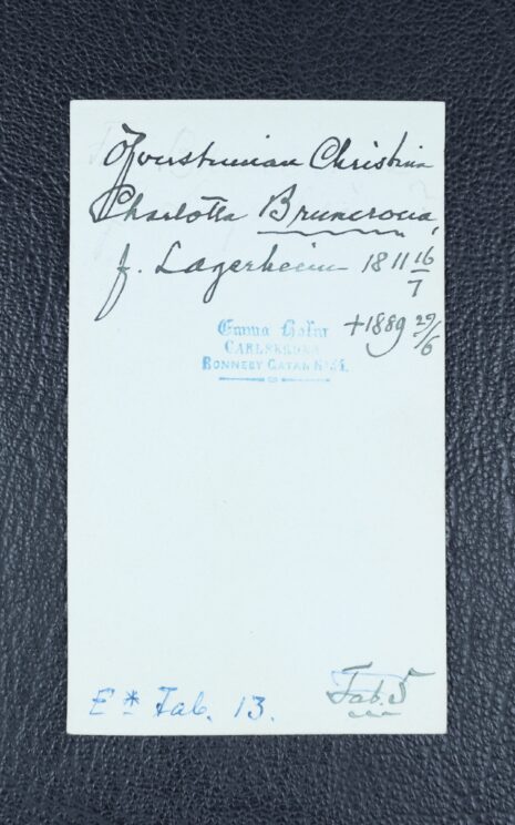Bruncrona, Christina CHARLOTTA, född Lagerheim, nr 2118 A. Född 1811-07-16. Död 1889-06-29.