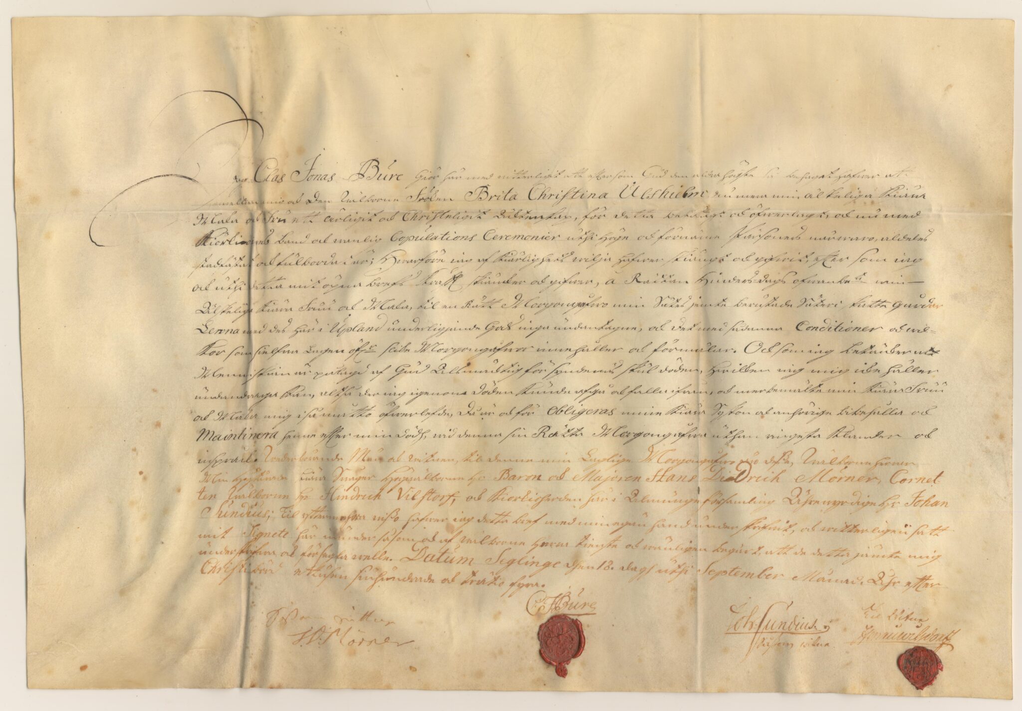 Morgongåvebrev daterat 1734-09-18. Dagen innan hade korpralen vid livregementet till häst, sedermera hovjunkaren, Claes Jonas Bure (1713–1781) gift sig med Birgitta Christina Ulfhielm (1713–1786). Med morgongåvebrevet skänker han sin nyblivna hustru ett antal gårdar.
