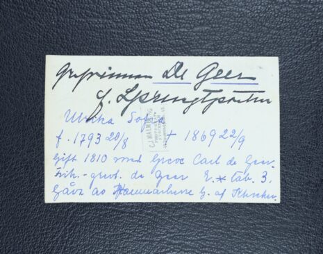 De Geer af Leufsta, Ulrika (ULLA) Sofia, född friherrinna Sprengtporten, nr 275. Född 1793-08-20. Död 1869-09-22.