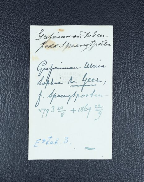 De Geer af Leufsta, Ulrika (ULLA) Sofia, född friherrinna Sprengtporten, nr 275. Född 1793-08-20. Död 1869-09-22.