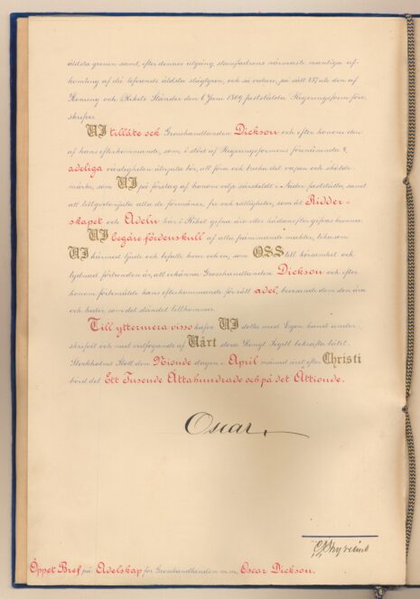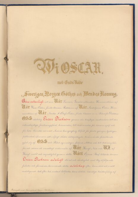 Sköldebrevet i original för utdöda adliga ätten Dickson, nr 2340.