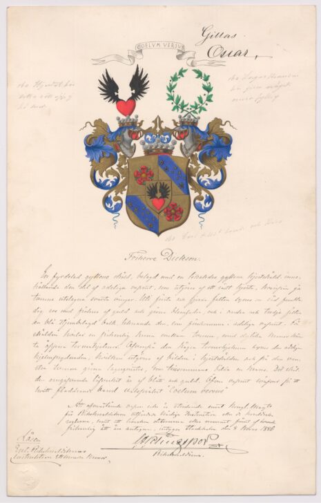 Utförd: Riksheraldiker C A Klingspor, Stockholm, 1886-03-08.
