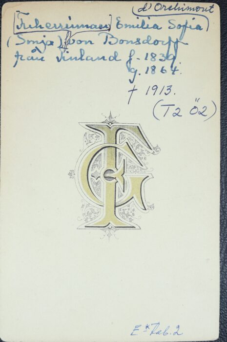 d’Orchimont, Emilia Sofia (SONJA), född finländsk friherrinna von Bonsdorff, nr 49. Född 1839-02-24. Död 1913-11-13.