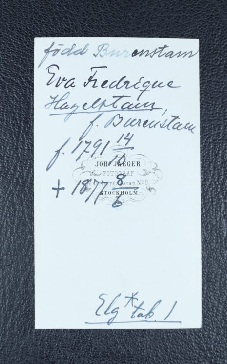Hagelstam, EVA Fredrika, född Burenstam, nr 2156. Född 1791-10-14. Död 1877-06-08.