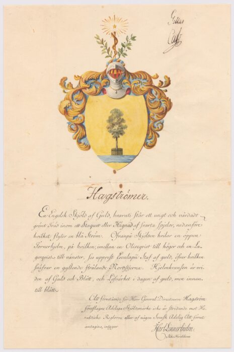 Approberad vapenritning för adliga ätten Hagströmer, nr 2230.