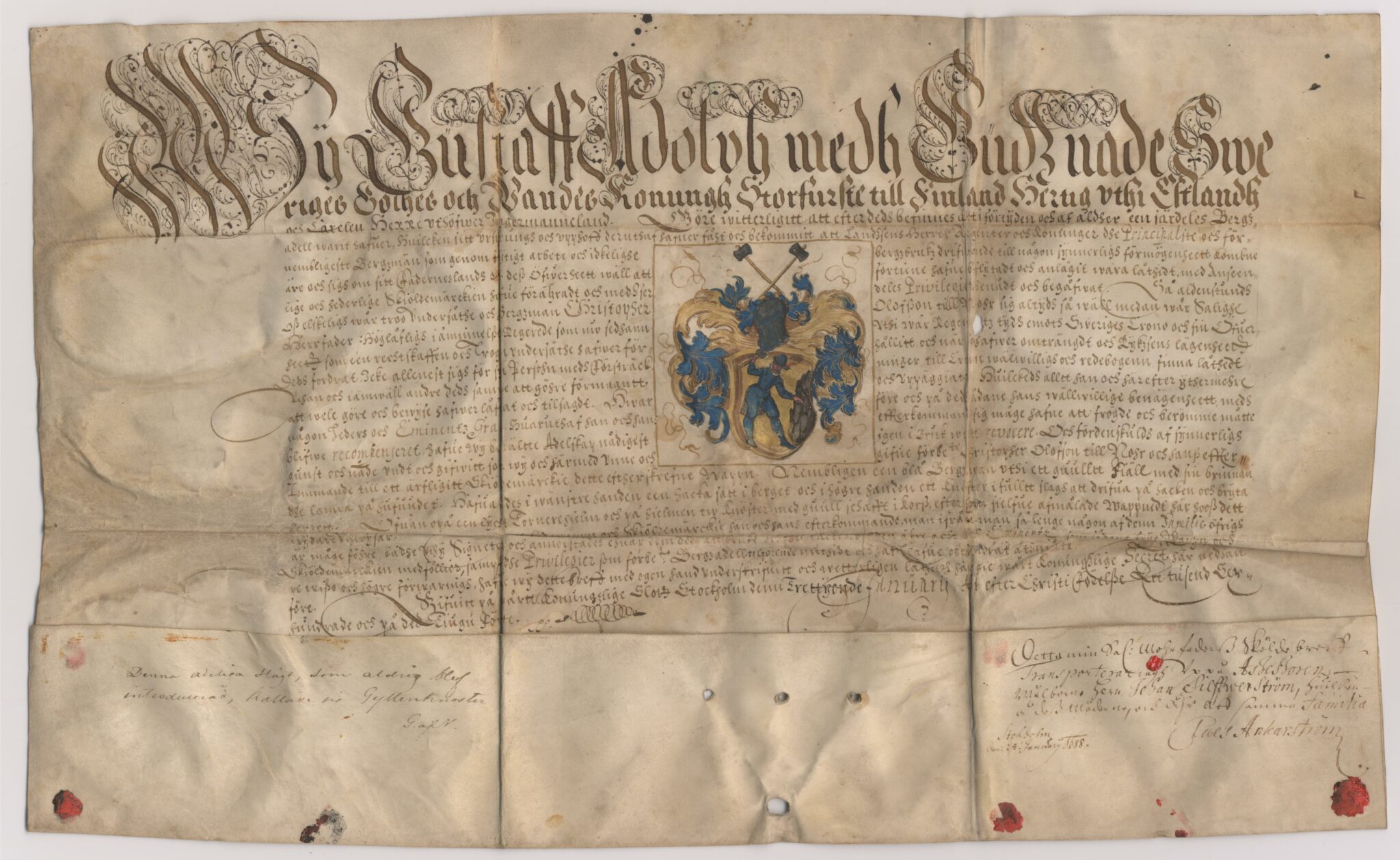Sköldebrevet i original för utdöda ointroducerade adliga ätten Kristofer Olofsson till Nor (Gyllenknoster).