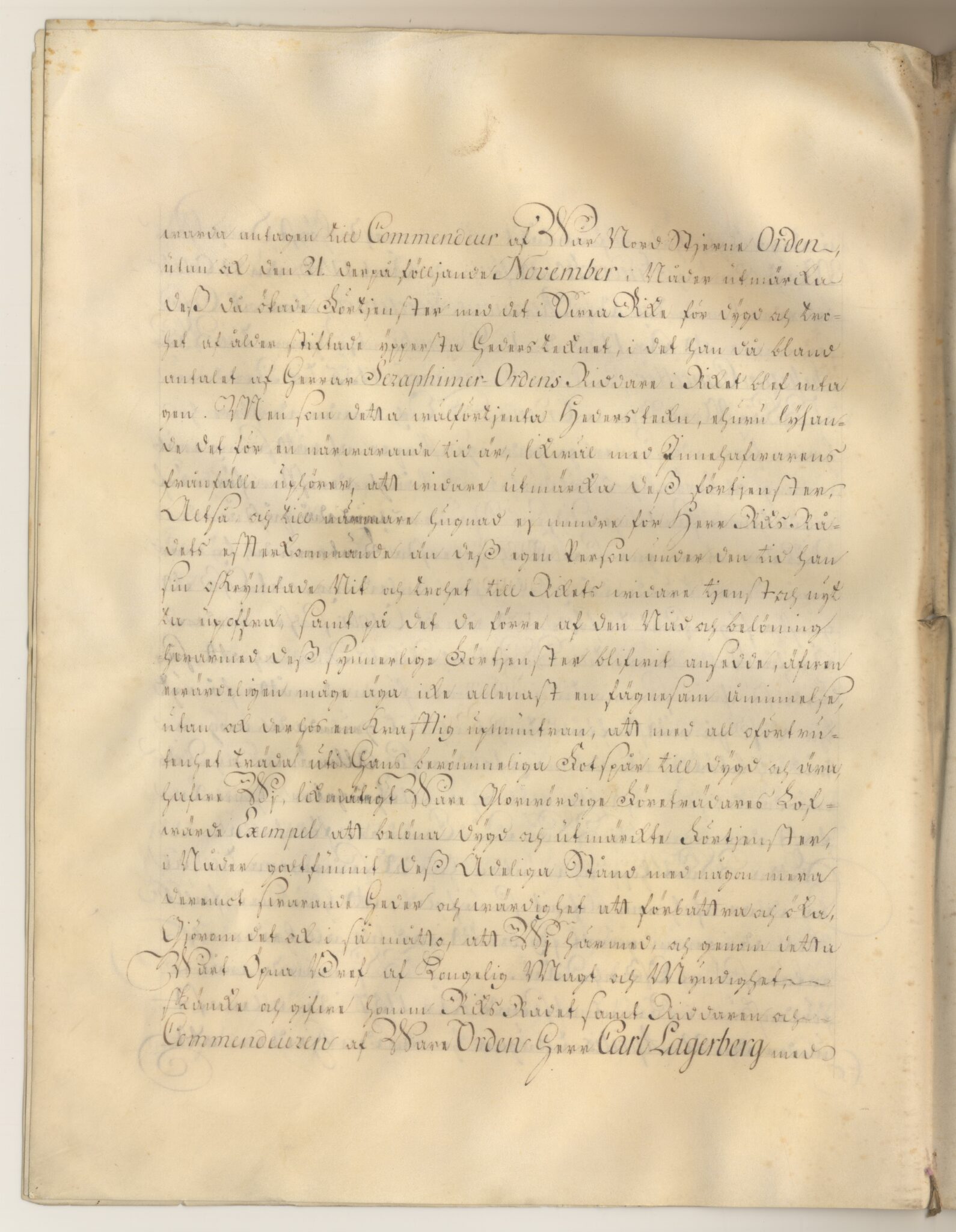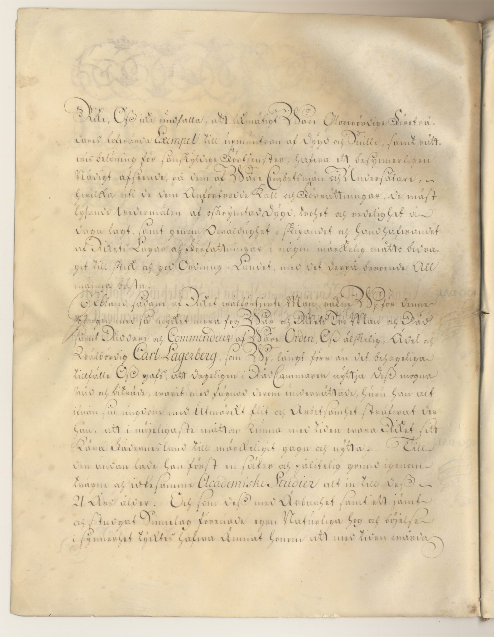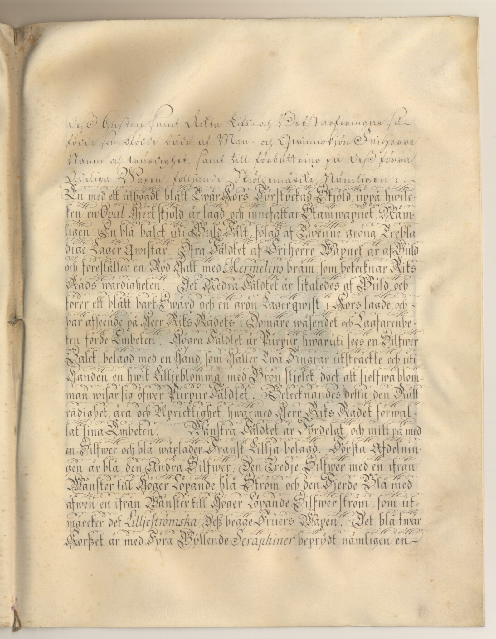 Friherrebrevet i original för utdöda ointroducerade friherrliga ätten Lagerberg.