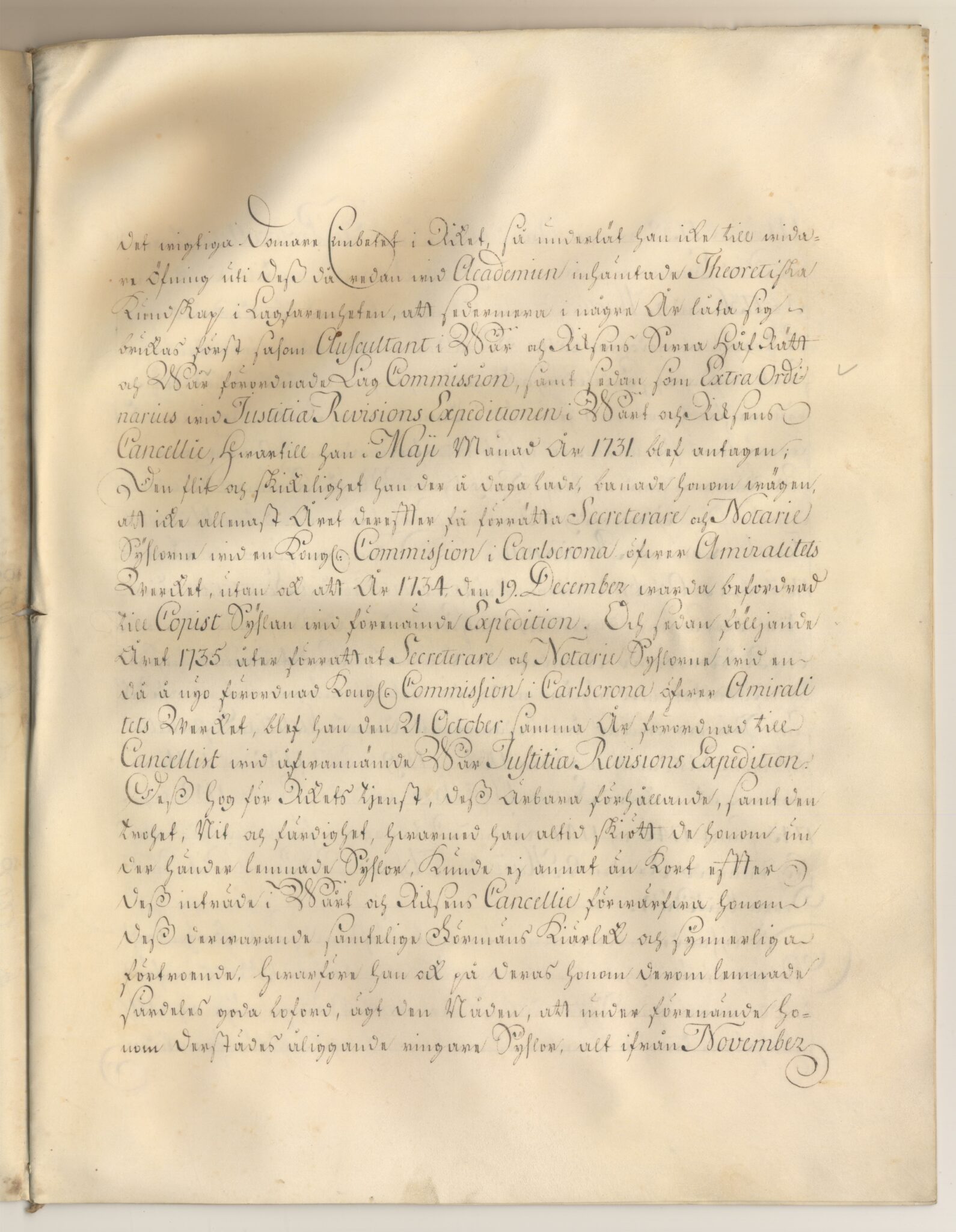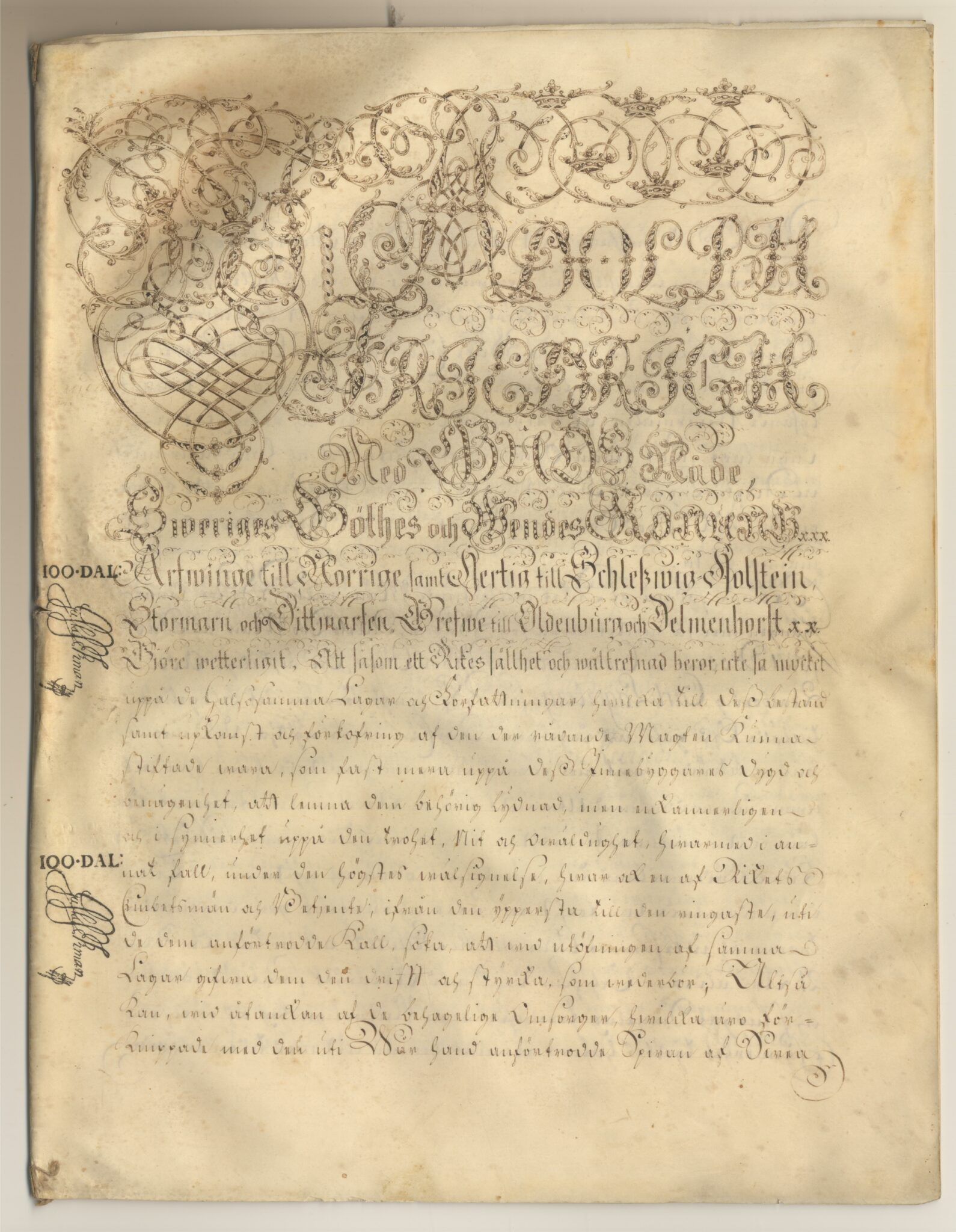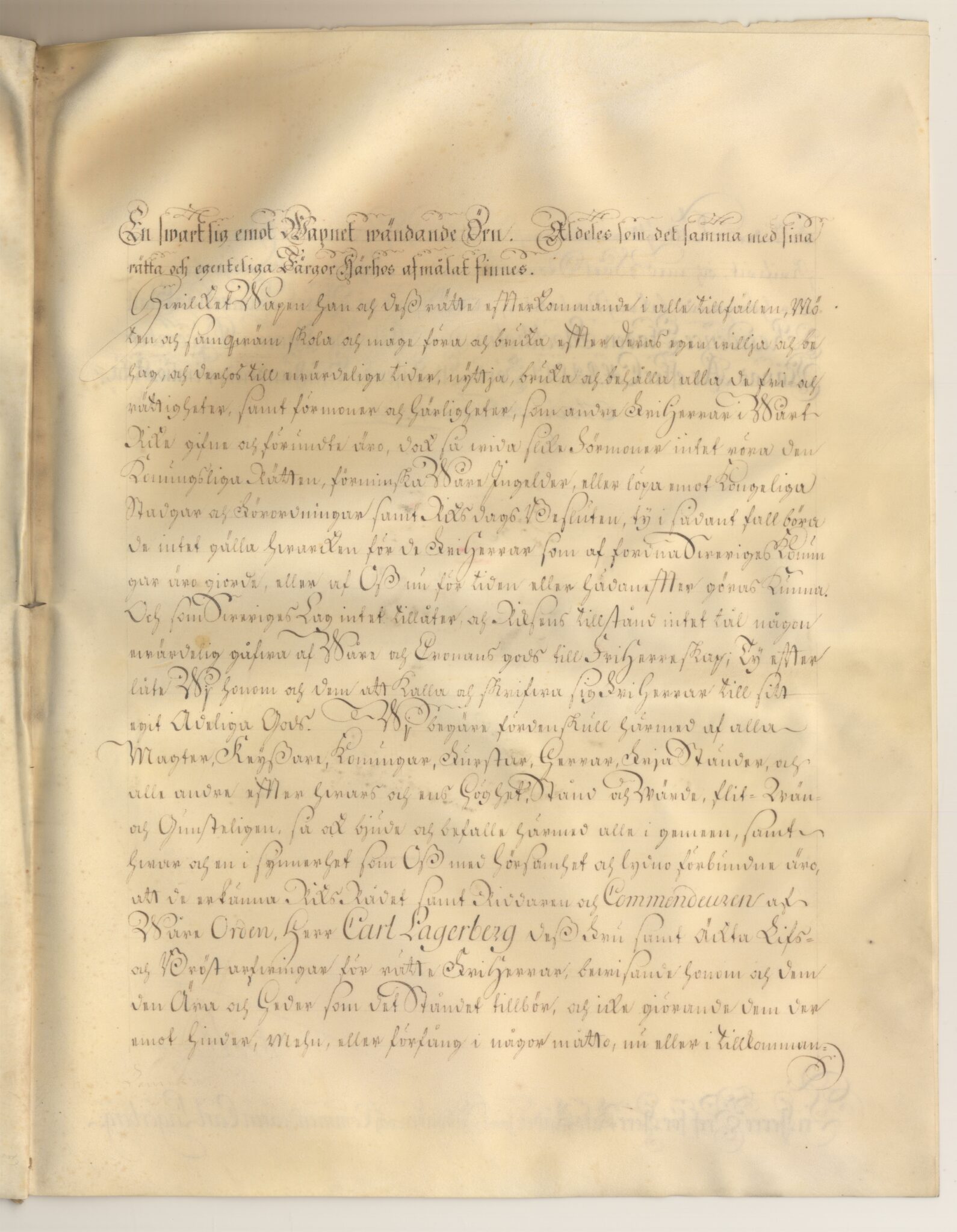 Friherrebrevet i original för utdöda ointroducerade friherrliga ätten Lagerberg.