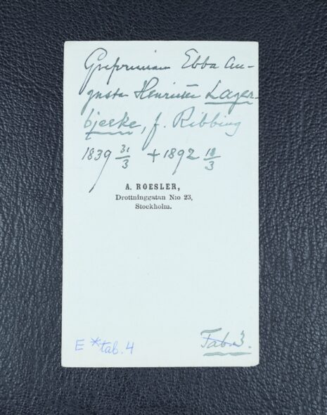 Lagerbjelke, EBBA Augusta Henrietta, född Ribbing, nr 15. Född 1839-03-31. Död 1892-03-18.
