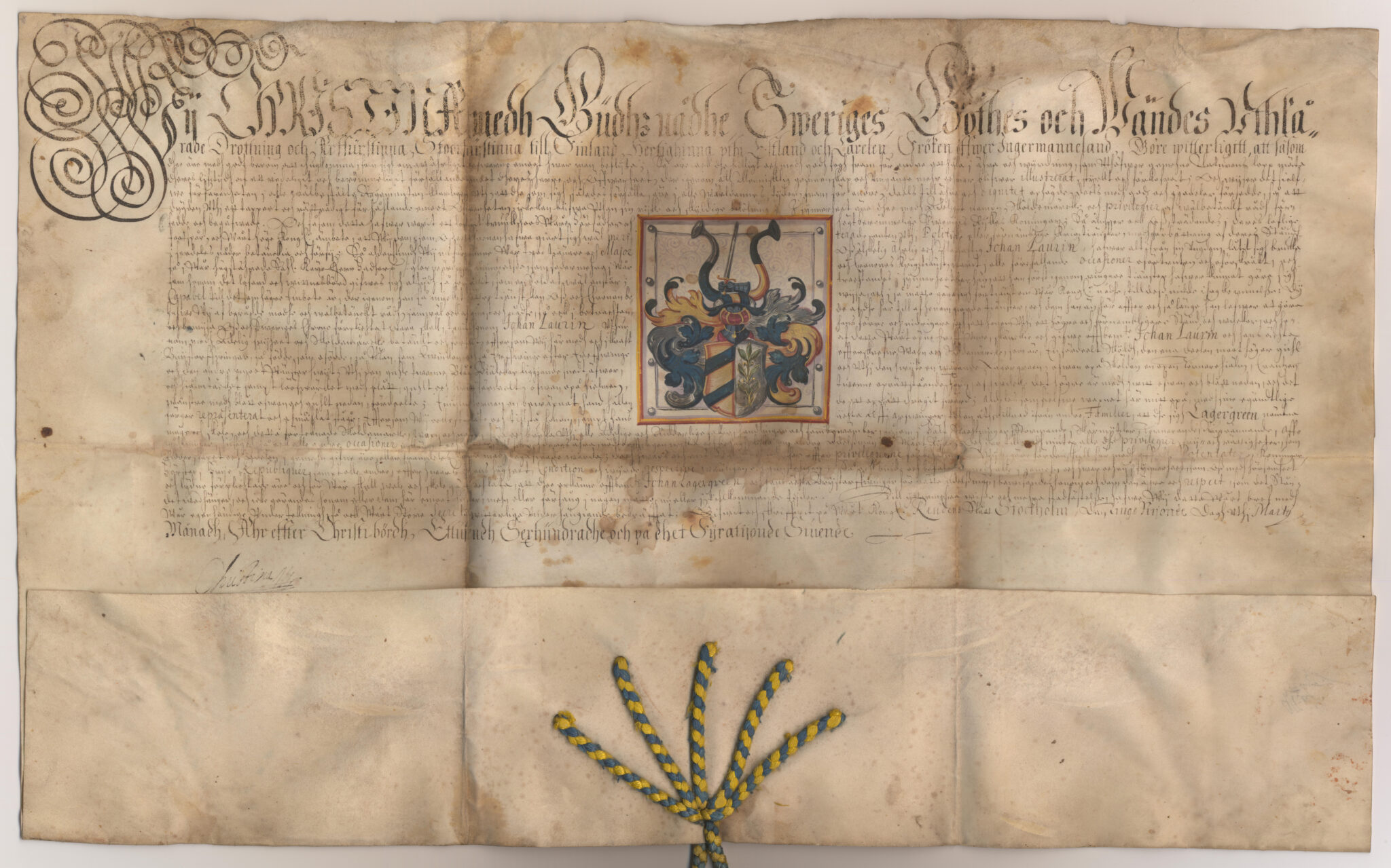 Sköldebrevet i original för adliga ätten Lagergréen, nr 391.